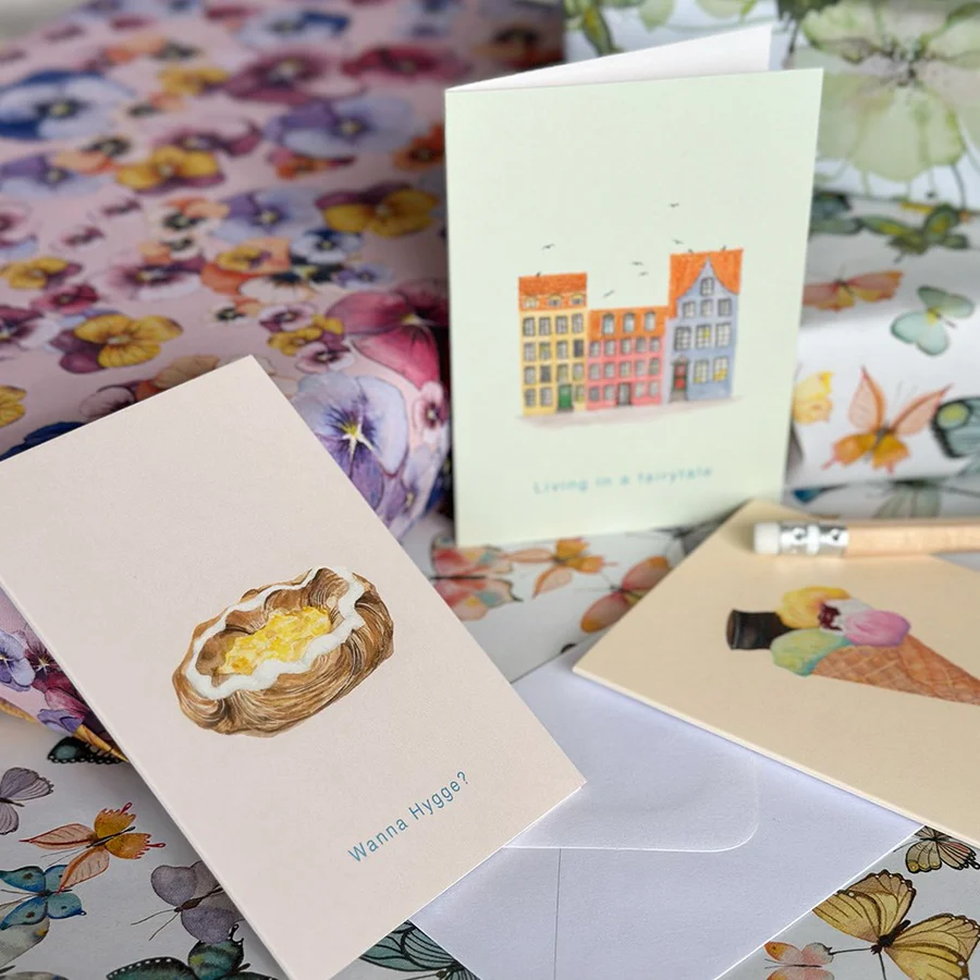 Designet med tryk af akvarel af håndmalede motiver fra serien: Danish.
