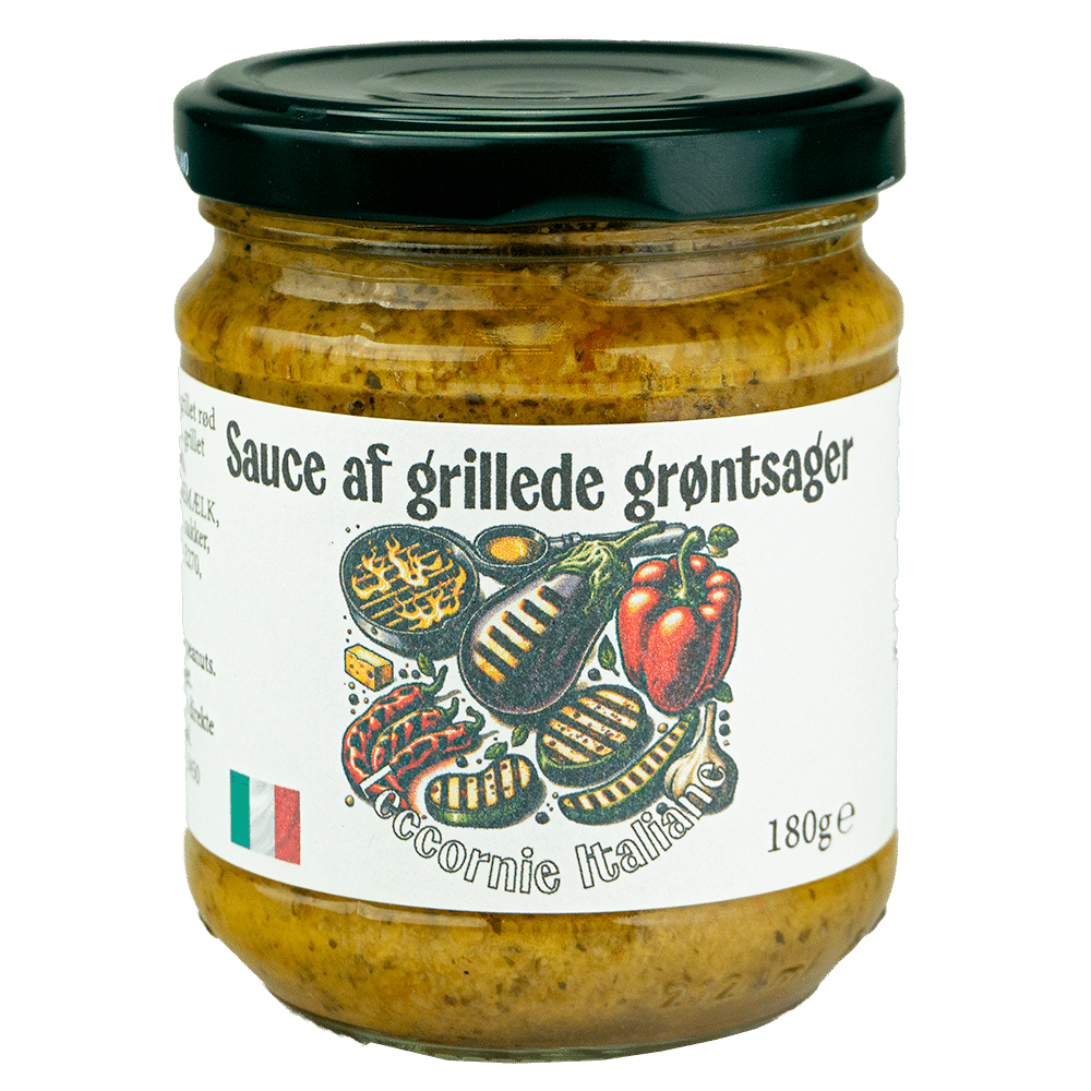 Solsikkeolie, grillet rød peber 15%, grillet aubergine 15%, grillet zucchini 15%, grillet gul peber 8%, olivenolie, OST (KOMÆLK, FÅREMÆLK, salt, osteløbe), salt, hvidløg, sukker, persille, kartoffelflager, surh.reg.: E270, sort peber, rødbedepulver. Kan indeholde spor af nødder og peanuts.
